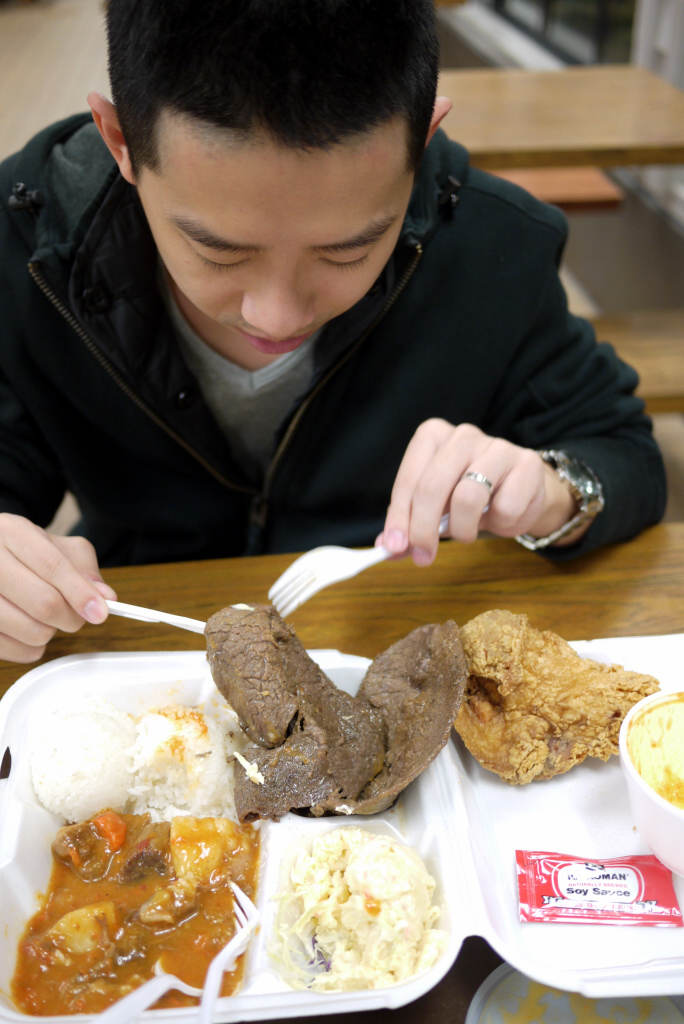我們一開始以為Cafe 100 會有像咖啡+三明治這類的東西, 但掃過一次menu 之後,完全找不到 Cafe 這東東, 所以大家不要被Cafe 100 的店名給誤導啦! 其實這間店真的不是賣咖啡的! 但提供的餐點到是很多,飯、麵、早餐、三明治、漢堡、Loco Moco 都有, 而且價錢都不到10USD唷! 看到餐館中有人吃著類似像炸雞飯的餐盒,一看到有飯眼睛又亮了! 就跟著點一樣的東西啦! 這份套餐的名字超可愛,叫作 Hilo Boy ! 不過我們兩個人的胃超娘,超小,就兩個人分一份 Hilo Boy 啦! 對我們的食量來說,吃完是八分飽,蠻剛好的!